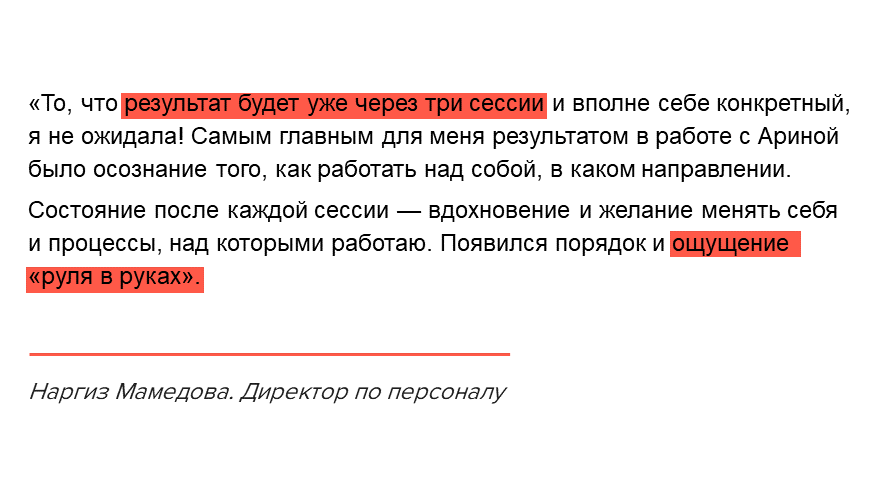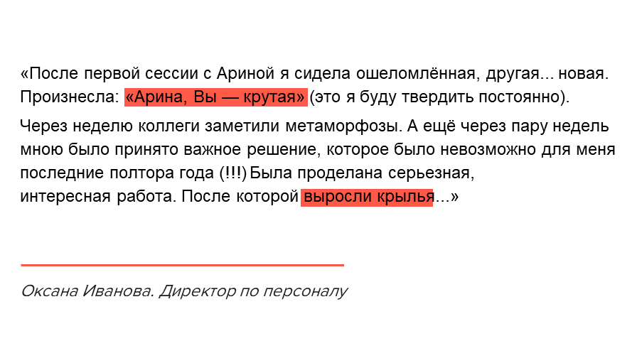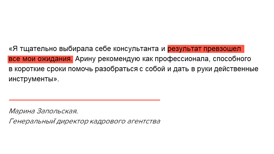 Затем мы уточняем комфортный для Вас формат занятости, структуру продвижения на рынке, образ подходящих работодателей или клиентов, сумму вознаграждения. Я помогаю Вам с помощью цепочки специальных вопросов взвешенно принять решение о том, куда двигаться дальше, чтобы не ошибиться с выбором и избежать ненужных компромиссов.